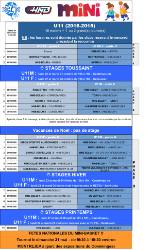 Calendrier matchs - stages BCLM - U11M-1 2025-2026
